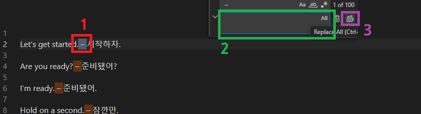 1번의 - 를 삭제하고 줄 바꿈을 하고자 한다면